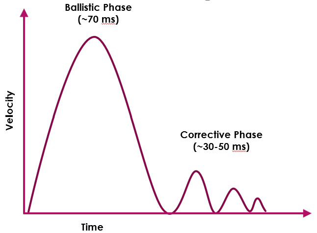 - Ballistic Phase (~70 ms) – basic aiming movement, fairly imprecise, essentially, a shot in the general direction of the target, without much control. Unless the player is incredibly skilled and hit the target after the first movement, the ballistic phase results in a slight overshoot or undershoot. Then, aiming transitions to the next phase.