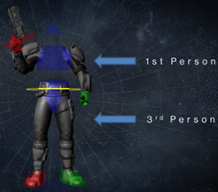 - Screen Space Effects – unlike the 3rd person view, the player doesn’t see the full character body, and some state changes must be communicated via screen space effects (e.g. low health, hit direction, etc.).